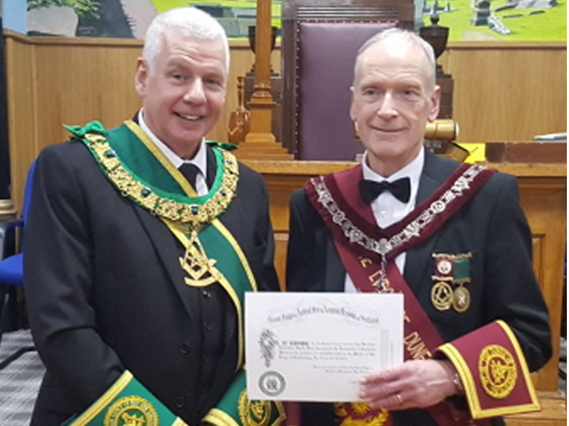 At this meeting he was invited to assist in presenting the Master Brother John Bean with his Installed Master's Certificate, the presentation being made by Brother Ronnie Blyth Past Master who was one of his Installing Masters.