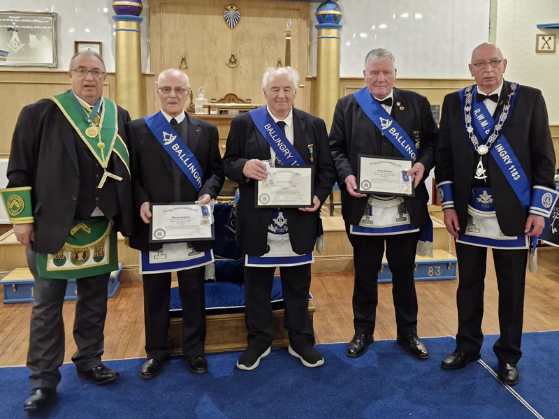 At the regular meeting of Lodge Ballingry No. 1183, held on Monday, 14 April 2025, three distinguished members were honoured with Jubilee Certificates in recognition of their long service to Lodge Ballingry. One for 60 years of membership and two for 50 years.